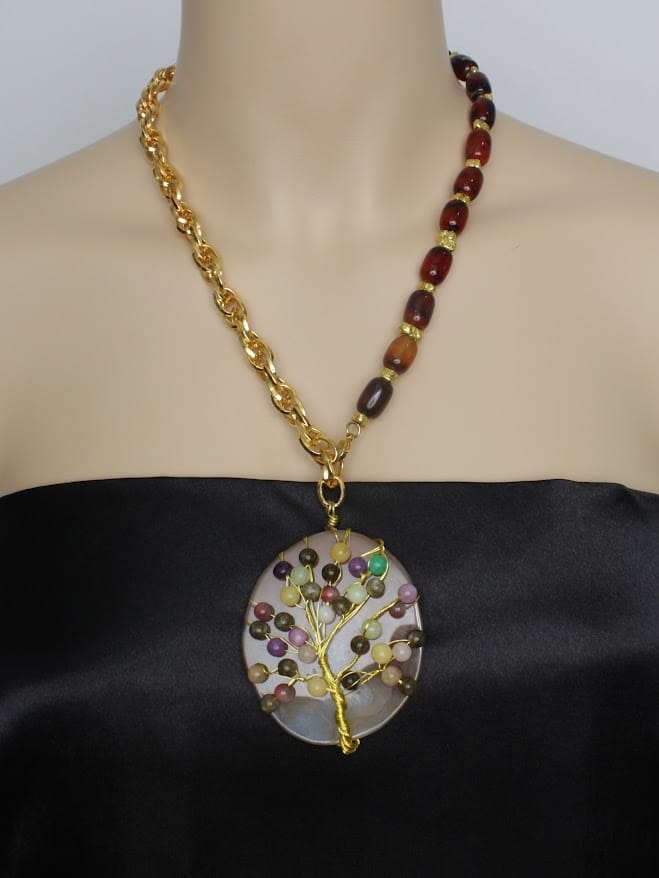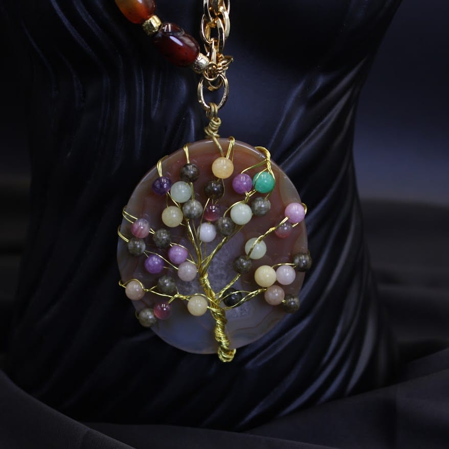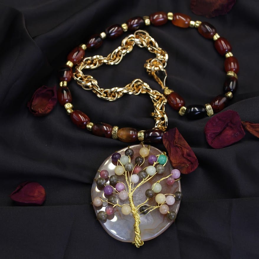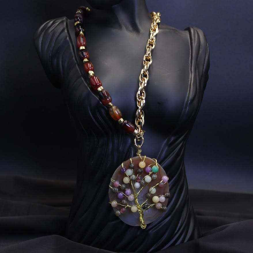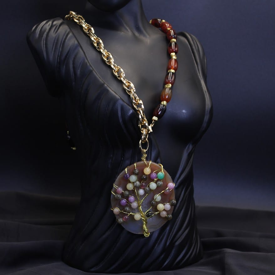 القطعة المركزية في التصميم هي الدلاية المصنوعة يدويًا من العقيق البرتقالي، والمشغولة بدقة بشكل شجرة الحياة، من أحجار متنوعة تم تثبيتها يدويًا بكل حب وصبر. هذه الدلاية هي التوقيع البصري للقلادة، ورمز العمق، النمو، والجمال.